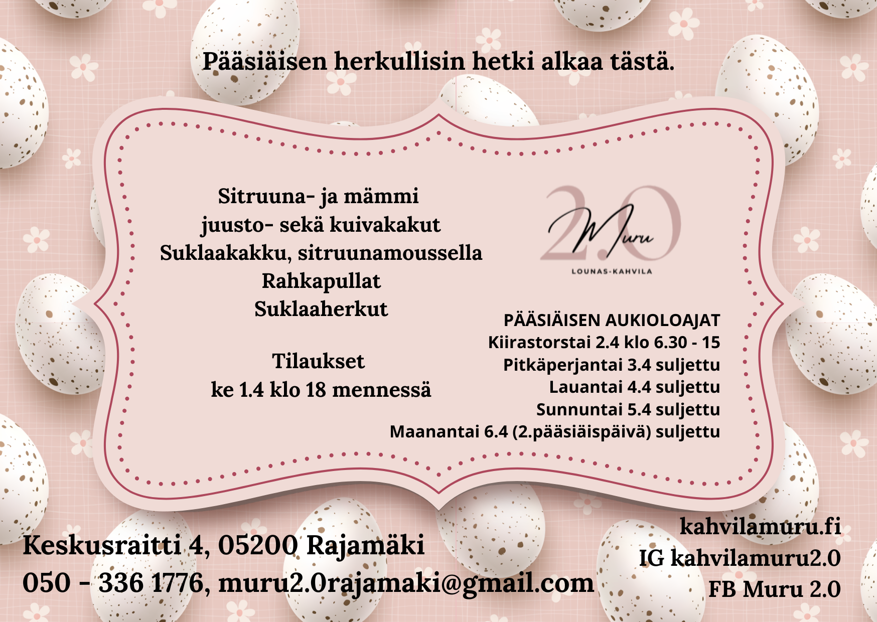 Arkisin Rajamäellä tuoksuu kotilounas, joka vie nälän ja ehkä sydämenkin. Meiltä saat myös herkulliset suolaiset ja makeat leivonnaiset sekä kakut, jotka saavat juhlapöydän näyttämään ja maistumaan täydelliseltä.